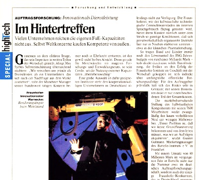 „Forschung und Entwicklung“ war das Motto des highTech-Specials in der WiWo 31/1992, das – wie damals alle diese Specials – extern vom Münchner Redaktionsbüro „Editor Network“ produziert wurde. Dessen Inhaber waren die vormaligen Chefredakteure des Magazins highTech, Fritz Bräuninger und Manfred Hasenbeck – und das Netzwerk dieser Editoren waren wir, die früheren Redakteure und Autoren von highTech. Mein Beitrag zum Thema F&E: die Rolle der „Fraunhoferei“ in der industriellen Forschung.